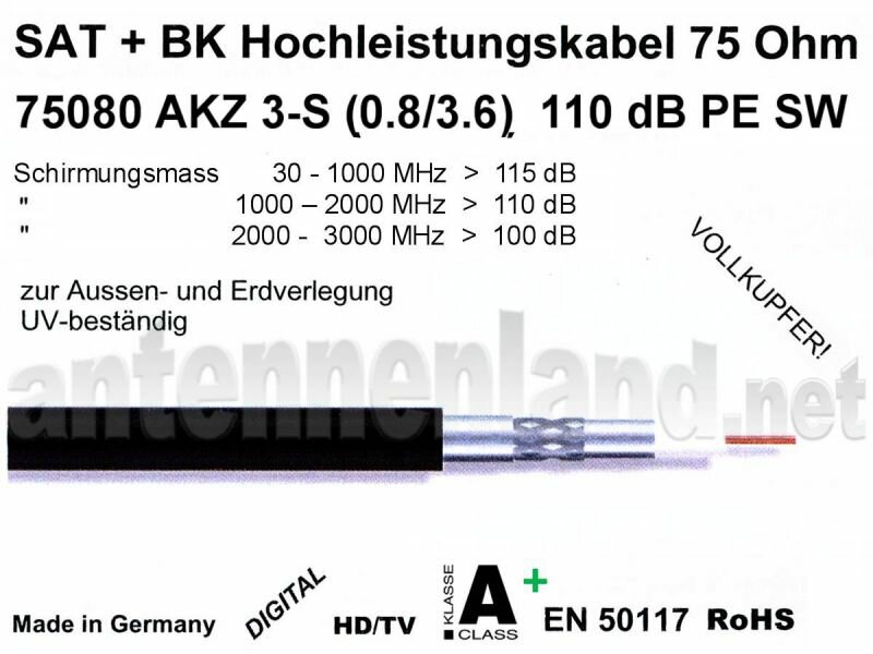 Aufgrund vieler Nachfragen nach einem dünneren UV-stabilen Outdoor-Kabel haben wir dieses Kabel anstelle des originalen weißen PVC-Mantels mit einem PE-Mantel in schwarz produzieren lassen. Ansonsten entspricht dieses Kabel in seinen elektrischen Eigenschaften dem neu entwickelten Kabel Sytronic 75080 AKZ A+ Hochleistungskabel, welches bei der Telekom und bei Kabel Deutschland nach KDG 1 TS 153 zugelassen ist. Hervorzuhebende Eigenschaften sind: