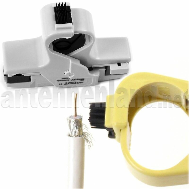 Doppel-Abisoliergerät für den Profi. Durch den Einsatz von zwei Klingeblöcken gleichzeitig ist das Werkzeug sowohl für 6 und 7 mm Koax-Kabel ( RG6, RG 59), als auch RG11 geeignet. Nach Einsatz der optionalen RC MINI-250 Kasette auch für Mini-Kabel einsetzbar.