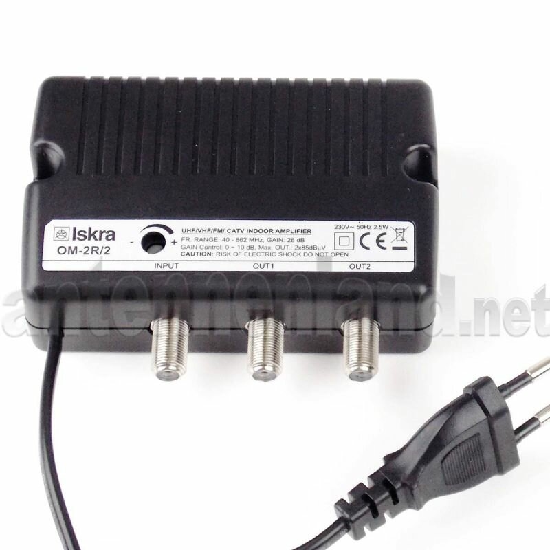 - Anschlüsse: F-Buchsen (1x Eingang, 2x Ausgang)