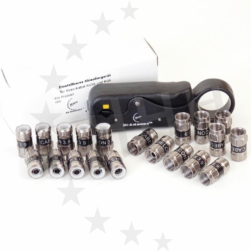 Perfekte Kompressionsverbindungen ohne Spezial-Kompressionswerkzeug. Hier im Paket: einstellbares Profi-Abisoliergerät und 20 F-59 3.9 Self Install Kompressionsstecker