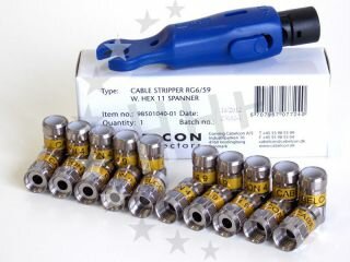 Perfekte Kompressionsverbindungen ohne Spezial-Kompressionswerkzeug. Hier im Paket: Abisoliergerät und 20 F-56 4.9 Self Install Kompressionsstecker