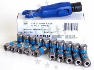 Perfekte Kompressionsverbindungen ohne Spezial-Kompressionswerkzeug. Hier im Paket: Abisoliergerät und 20 F-56 5.1 Self Install Kompressionsstecker