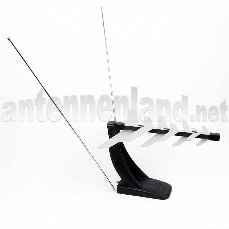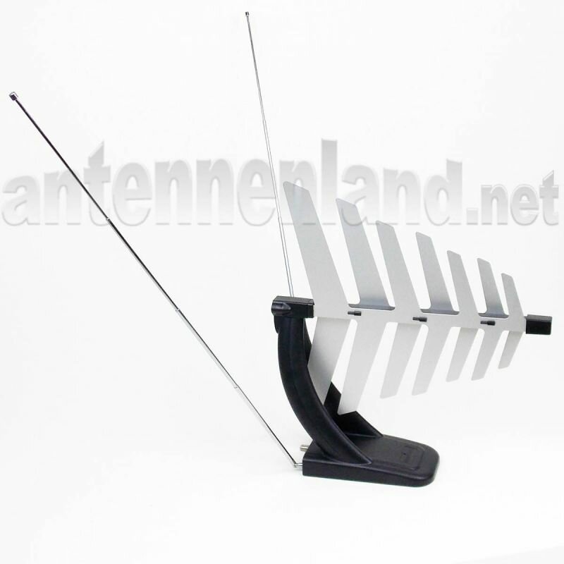 Zwei zusätzlich am Standfuß montierte Teleskopantennen ermöglichen darüber hinaus den FM/UKW- und VHF/DAB+ - Empfang. Sie ist, wie alle DVB-T-Antennen, natürlich auch DVB-T2-/HDTV-kompatibel.
