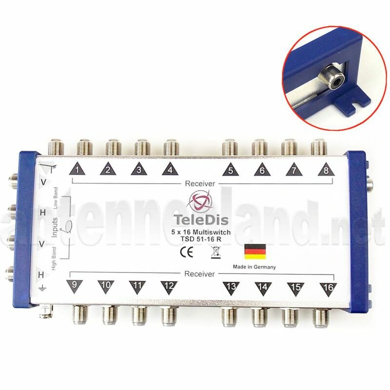 Bei dem TSD 51-16 R (Made in Germany) handelt es sich um einen Multischalter für komplett receivergespeiste Verteilnetze für ein Satellitensystem. Durch ein neues energieeffizientes Powermanagement-Konzept ist der Receiver in der Lage, sowohl den Multischalter als auch das angeschlossene Quatro-LNB zu versorgen. Dadurch ist kein Netzteil erforderlich; die Spannungsversorgung erfolgt komplett durch die Receiver. An jedem der 16 Ausgänge kann ein herkömmlicher Receiver mit 14V/18V/22kHz-Steuerung betrieben werden.