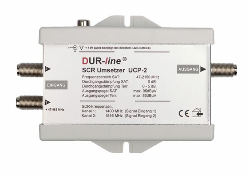 Mit dem neuen UCP-2 SCR-Umsetzer können über 1 Leitung 2 Fernsehgeräte von einem oder zwei Satelliten (maximal 8 Satelliten-ZF-Ebenen) über eine Leitung versorgt werden. Zusätzlich kann noch terrestrisch bzw. DVBT und UKW mit übertragen werden. Der UCP-2 SCR-Umsetzer erzeugt zwei SCR- (Satellit Channel Router) Frequenzen. Diese ermöglichen z.B. einem Festplattenreceiver mit Twin-Tunern zwei verschiedene Fernsehprogramme gleichzeitig über nur ein Kabel zu empfangen. Die Montage des DUR-line ® UCP 2 ist Dank der übersichtlichen Beschriftung sehr einfach. Verbinden Sie 2 freie Ausgänge des Multischalters mit den Eingängen des UCP-2 und den Ausgang des UCP-2 mit der Ableitung. Statt des Multischalters können Sie auch ein Twin, Quad oder Octo LNB verwenden. Jeder Ein-Kabel taugliche Receiver oder Sat-Tuner Ihres Fernsehgerätes, der die europäische Norm EN50494 unterstützt, kann dafür verwendet werden. Der UCP-2 SCR-Umsetzer wurde komplett in Deutschland entwickelt und gefertigt. ?Made in Germany?. Ein Netzteil wird beim Anschluss an einen Multischalter nicht benötigt, die Spannungsversorgung kommt vom Multischalter und den Receivern. Beim direkten Anschluss an ein Twin, Quad oder Octo LNB kann die Versorgungsspannung des Receivers nicht ausreichen. Bei dieser Montage empfehlen wir generell ein Netzteil. Dieses ist nicht im Lieferumfang enthalten. Das Ein-Kabel-System ist die sowohl für Nachrüstung bestehender Leitungen als auch für Neuinstallation bestens geeignet.