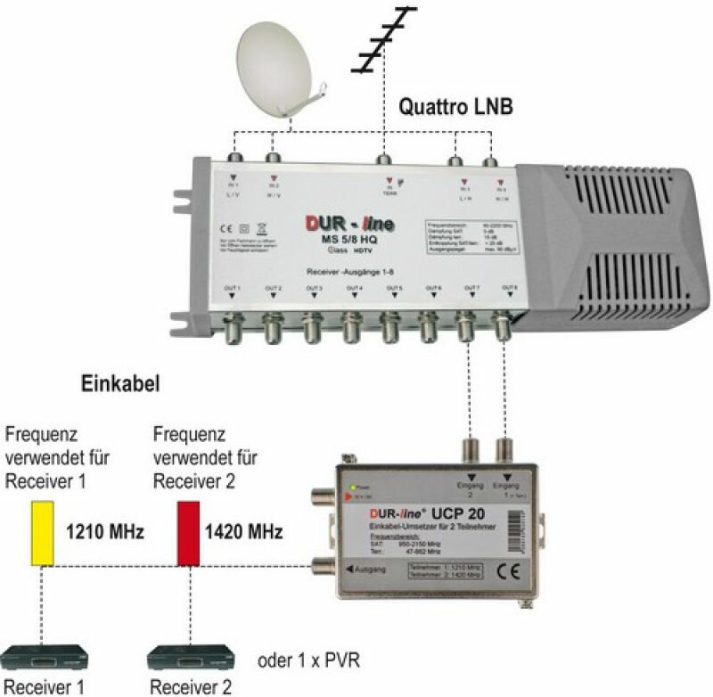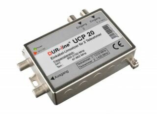 Mit dem UCP-20 SCR-Umsetzer können über 1 Leitung 2 Fernsehgeräte von einem oder zwei Satelliten (maximal 8 Satelliten-ZF-Ebenen gleichzeitig) über eine Leitung versorgt werden. Zusätzlich kann noch terrestrisch bzw. DVBT und UKW mit übertragen werden. Der UCP-20 SCR-Umsetzer erzeugt zwei SCR- (Satellit Channel Router) Frequenzen. Diese ermöglichen z.B. einem Festplattenreceiver mit Twin-Tunern zwei verschiedene Fernsehprogramme gleichzeitig über nur ein Kabel zu empfangen. Die Montage des DUR-line ® UCP 20 ist dank der übersichtlichen Beschriftung sehr einfach. Verbinden Sie zwei freie Ausgänge des Multischalters mit den Eingängen des UCP-20 und den Ausgang des UCP-20 mit der Ableitung. Statt des Multischalters können Sie auch ein Twin, Quad oder Octo LNB verwenden. Jeder Ein-Kabel taugliche Receiver oder Sat-Tuner Ihres Fernsehgerätes, der die europäische Norm EN50494 unterstützt, kann dafür verwendet werden. Das Ein-Kabel-System ist die sowohl für Nachrüstung bestehender Leitungen als auch für Neuinstallation bestens geeignet.